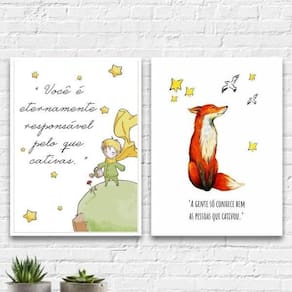 Kit 2 quadros pequeno príncipe aquarela 45x34cm - com vidro Moldura: madeira preta Informações do produto tire todas as suas dúvidas no descritivo abaixo: decoração para quarto, sala, cozinha, escritório, área gourmet e muito mais. Chega de paredes vazias medidas - cada peça tem 45x34cm a3 . Material do papel - papel fotográfico brilhante de altíssima resolução acabamento - todos os quadros são acompanhados de vidro para proteção da imagem. - moldura em madeira maciça na cor preta e pendurador . - os quadros são embalados de forma segura com plástico bolha com camada dupla de acordo com o tamanho dos quadros. Garantia - garantia de 3 meses. Meu quadro chegou. Como posso fixá-lo Você precisa apenas de um martelo e um prego, pois os quadros já vão acompanhados de penduradores. Esta é a forma mais indicada. Como posso limpar meu quadro A limpeza é feita como um móvel comum da sua casa. Apenas um pano seco ou espanador são suficientes para tal