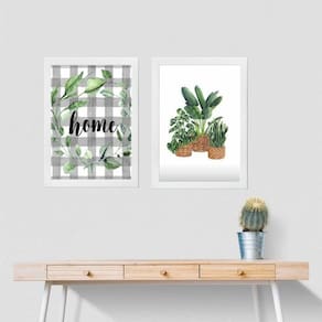 Kit 2 quadros plantas - home 33x24cm Moldura: madeira branca Informações do produto tire todas as suas dúvidas no descritivo abaixo: decoração para quarto, sala, cozinha, escritório, área gourmet e muito mais. Chega de paredes vazias medidas - cada peça tem 33x24cm a4 . Material do papel - papel fotográfico brilhante de altíssima resolução acabamento - todos os quadros são acompanhados de uma película de acetato para proteção da imagem. - os quadros são embalados de forma segura com plástico bolha com camada dupla de acordo com o tamanho dos quadros. Garantia - garantia de 3 meses. Meu quadro chegou. Como posso fixá-lo Você precisa apenas de um martelo e um prego, pois os quadros já vão acompanhados de penduradores. Esta é a forma mais indicada. Caso prefira, você pode utilizar uma fita dupla face neste caso, sugerimos de alta qualidade para evitar que descole e seu quadro caia . Como posso limpar meu quadro A limpeza é feita como um móvel comum da sua casa. Apenas um pano seco ou espanador são suficientes para tal