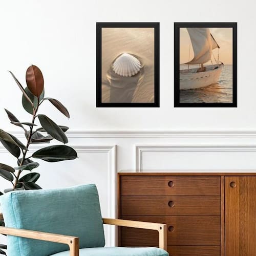 Kit 2 quadros praia bege - concha e barco 33x24cm Cor: moldura preta Informações do produto tire todas as suas dúvidas no descritivo abaixo: decoração para quarto, sala, cozinha, escritório, área gourmet e muito mais. Chega de paredes vazias medidas - cada peça tem 33x24cm a4 . Material do papel - papel fotográfico brilhante de altíssima resolução acabamento - todos os quadros são acompanhados de uma película de acetato para proteção da imagem. - os quadros são embalados de forma segura com plástico bolha com camada dupla de acordo com o tamanho dos quadros. Garantia - garantia de 3 meses. Meu quadro chegou. Como posso fixá-lo Você precisa apenas de um martelo e um prego, pois os quadros já vão acompanhados de penduradores. Esta é a forma mais indicada. Caso prefira, você pode utilizar uma fita dupla face neste caso, sugerimos de alta qualidade para evitar que descole e seu quadro caia . Como posso limpar meu quadro A limpeza é feita como um móvel comum da sua casa. Apenas um pano seco ou espanador são suficientes para tal