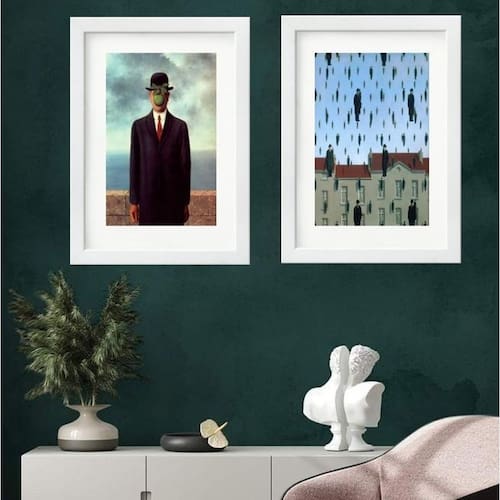 Kit 2 quadros rené magritte - 60x48cm Moldura: madeira preta Informações do produto tire todas as suas dúvidas no descritivo abaixo: decoração para quarto, sala, cozinha, escritório, área gourmet e muito mais. Chega de paredes vazias medidas - cada peça tem 60x48cm . Material do papel - papel fotográfico brilhante de altíssima resolução acabamento - todos os quadros são acompanhados de vidro para proteção da imagem. - moldura em madeira maciça na cor preta ou branca conforme produto escolhido e pendurador. - paspatur branco com 7cm de largura - os quadros são embalados de forma segura com plástico bolha com camada dupla de acordo com o tamanho dos quadros. Garantia - garantia de 3 meses. Meu quadro chegou. Como posso fixá-lo Você precisa apenas de um martelo e um prego, pois os quadros já vão acompanhados de penduradores. Esta é a forma mais indicada. Como posso limpar meu quadro A limpeza é feita como um móvel comum da sua casa. Apenas um pano seco ou espanador são suficientes para tal