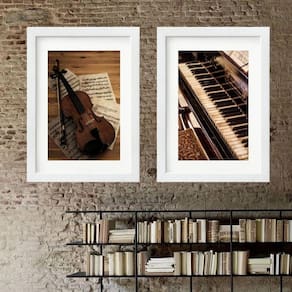 Kit 2 quadros violino e piano - 60x48cm Moldura: madeira branca Informações do produto tire todas as suas dúvidas no descritivo abaixo: decoração para quarto, sala, cozinha, escritório, área gourmet e muito mais. Chega de paredes vazias medidas - cada peça tem 60x48cm . Material do papel - papel fotográfico brilhante de altíssima resolução acabamento - todos os quadros são acompanhados de vidro para proteção da imagem. - moldura em madeira maciça na cor preta ou branca conforme produto escolhido e pendurador. - paspatur branco com 7cm de largura - os quadros são embalados de forma segura com plástico bolha com camada dupla de acordo com o tamanho dos quadros. - de 3 meses. Meu quadro chegou. Como posso fixá-lo Você precisa apenas de um martelo e um prego, pois os quadros já vão acompanhados de penduradores. Esta é a forma mais indicada. Como posso limpar meu quadro A limpeza é feita como um móvel comum da sua casa. Apenas um pano seco ou espanador são suficientes para tal Marca: Não Informado Ean: 7895530146822