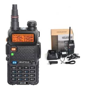 Rádio Baofeng UV5R com alcance de aproximadamente 12 quilômetros em campo aberto, como fazenda, sítio, praia, entre outros, e aproximadamente 800 metros em ambientes fechados, com divisórias, paredes. Permite ouvir rádio FM e possui lanterna com luz de LED para emergências.