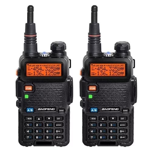 Rádio Baofeng UV5R com alcance de 12 quilômetros aproximadamente em campo aberto, como fazenda, sítio, praia, entre outros, e 800 metros aproximadamente em ambientes fechados, com divisórias, paredes por exemplo. Além de se comunicar, você poderá ouvir rádio FM nele, e possui uma lanterna com luz de LED bem forte em caso de emergências.