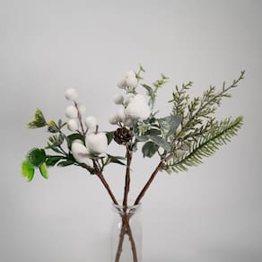 Cada fruta branca deste arranjo reflete o brilho e o calor da temporada, imitando a rica tonalidade e textura das frutas vermelhas frescas do inverno. Intercaladas com delicadas folhas verdes, estas frutas criam um contraste visual encantador, evocando memórias de ceias natalinas e momentos ao redor da lareira.