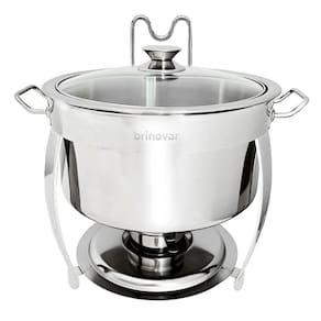 O Rechaud Redondo 8 Litros Brinovar tem a estrutura e o fogareiro em Aço Inox: altamente durável, resistente e fácil de limpar. Possui a tampa em vidro temperado, com saída de vapor. Vem com um prático apoio para tampa. A substituição da cuba é muito simples, podendo ser realizada durante o uso do produto, sem prejudicar o serviço