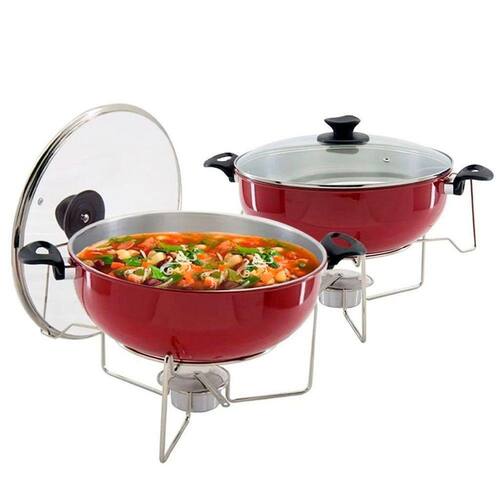 Rechauds em alumínio com tampa de vidro temperado, suporte para a panela com descanso para a tampa e queimador a álcool.