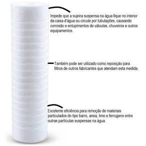 Garantia: 90 dias / Peso: 140g / Cor predominante: branco / Referência: 7898942709647 Dimensões: 6cm (C) x 6cm (L) x 25cm (A); Vazão nominal: 1.200 Litros/Hora; Temperatura: 5°C á 50°C; Vida útil: a troca do refil é recomendada a cada 6 meses ou quando houver redução do fluxo d’água, o que ocorrer antes; Retenção de partículas - classe D (>15 a