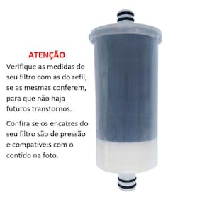 Características Técnicas - Cor: Transparente - Vida útil: 1000 litros - Vazão: 20 litros/hora - Retenção de Partículas: Classe D 15 a 30 micra - Temperatura de Operação: 1 a 40 °C - Pressão de Operação: 29 a 392 kPa 3 a 40 mca - Peso Líquido: 0,100 kg - Peso Bruto: 0,107 kg.