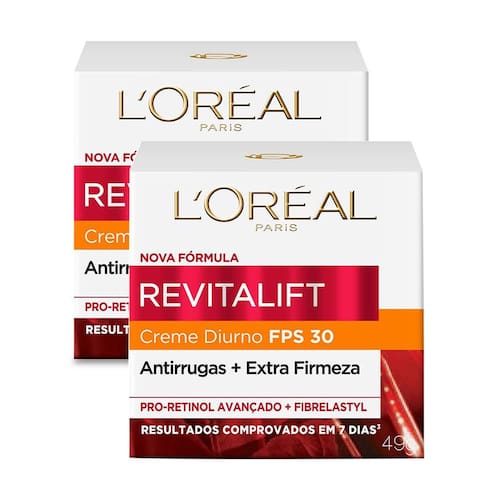 REVITALIFT DERMO-EXPERTISE L'ORÉAL FPS 18 CREME ANTIRRUGAS DIURNO Pro-Retinol A forte + Fibre-Elastyl para uma epiderme mais firme e fibras de elastina mais resistentes. Possui Pro-Retinol A em sua formulação que é um poderoso ativo antirrugas, que estimula a renovação celular. Rugas ainda mais profundas são visivelmente suavizadas e a pele têm sua aparência uniformizada. Já a melhora da firmeza fica por conta do ativo Fibre Elastyl, ingrediente ativo inovador, resultado de 5 anos de pesquisa e patenteado por L’Oréal, protege as fibras de elastina e degradação*, fazendo com que elas fiquem mais numerosas e fortalecidas Proteção UVA/UVB: O sistema filtrante de espectro FPS 18 anti UVA/UVB combate eficazmente os raios responsáveis pelo envelhecimento prematuro da pele, além de prevenir manchas solares. *teste in vitro Modo de usar: Aplicar sobre a pele do rosto, pescoço e colo limpa e seca em movimentos suaves e ascendentes pela manhã. Marca: Não Informado