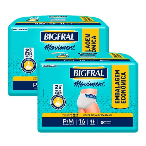 CINTURA ELÁSTICA MODELADORA Cintura elástica que contribui para a melhor adaptação da roupa íntima ao corpo, proporcionando total discrição e conforto. ABSORVE EM SEGUNDOS* Com camada protetora que mantém a pele seca através de uma rápida distribuição de urina, menor retorno e máxima absorção. BARREIRA PROTETORA ANTIVAZAMENTO Proporciona proteção extra contra vazamentos, permitindo que você se movimente naturalmente no seu dia a dia. SISTEMA ANTIODOR Sistema que neutraliza o odor da urina, contribuindo para seu bem-estar. Bigfral Moviment Feminina é a calcinha descartável ideal para incontinência moderada a intensa. Foi desenvolvida especialmente para mulheres, pois além de ser discreta, tem toque suave como algodão proporcionando maior conforto. Absorve em segundos mantendo a umidade longe da pele e deixando-a até 2x mais seca. As barreiras antivazamento e o controle de até 100% dos odores proporcionam segurança para que você desfrute seu dia e se movimente com confiança. Ean: 7896012879696