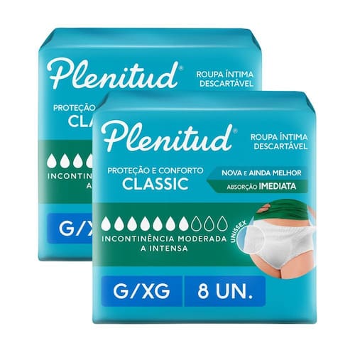 Roupa Íntima Plenitud Classic Tamanho G/XG 8 Unidades Apresentamos a Roupa Íntima Plenitud Classic com nova embalagem e produto ainda melhor! Oferece Proteção 360º e ajuste perfeito. Desenvolvida especialmente para incontinência intensa, agora proporciona absorção em segundos e uma nova tecnologia que garante até zero odor, mantendo você seca e confiante. Diferente de uma fralda geriátrica, a linha de Roupa Íntima Plenitud é fácil de vestir e tirar, além de ser mais discreta. Tenha mais liberdade e confiança no seu dia a dia com a nova Roupa Íntima Plenitud Classic. Ean: 7896007552962