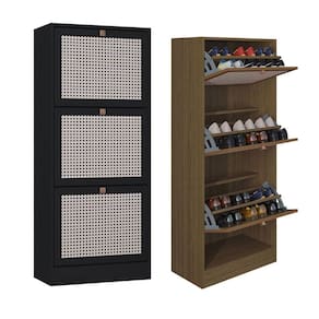 Kit 2 Sapateiras Tropical 3 Portas Multiuso Vertical Poquema Carvalho/preto Procurando uma solucao inteligente e elegante para a bagunca de sapatos? Conheca o Kit com 2 Sapateiras Tropical 3 Portas Multiuso Vertical. Este kit foi pensado para quem deseja otimizar o espaco sem abrir mao de um design diferenciado, transformando seu quarto, closet ou lavanderia em um ambiente mais organizado e cheio de personalidade. Chega de calcados espalhados! Com a estrutura vertical, voce ganha espaco e praticidade, mantendo tudo arrumado e de facil acesso.