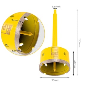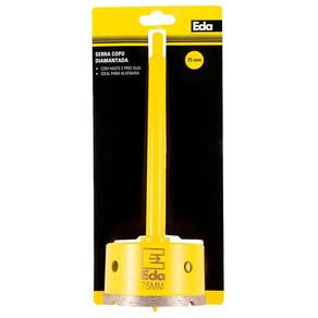 Kit com 2 Serra Copo Diamantada 75mm com Haste Pino Guia Eda Serra copo diamantada com haste e pino guia, indicada para cortar telhas, tijolos, cerâmicas, azulejos, concreto, parede, pedras, refratários, granitos entre outros. - Marca: Eda - Jogo exclusivo com 2 serras copo - Diâmetro: 75mm - Serra Copo com haste e pino guia - Ideal para alvenaria - Comprimento da haste: 170mm - Diâmetro do encaixe da haste no mandril: 8,8mm - Altura externa do copo: 47mm - Altura da borda diamantada: 7mm - Espessura do copo: 3,5 mm - Facilita a realização de furos de grandes diâmetros em tempo reduzido - Indicada para cortar telhas, tijolos, cerâmicas, azulejos, concreto, parede, pedras, refratários, granitos entre outros. - Quando utilizada com o pino guia, deve-se fazer um furo com broca de vídea antes. - Nunca utilizar o equipamento na função IMPACTO/MARTELETE - Haste e corpo em aço carbono - Camada de corte: Pasta abrasiva com diamante - Utilize com refrigeração - Peso bruto: 500 gramas - : 90 dias