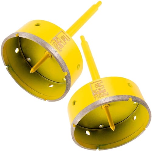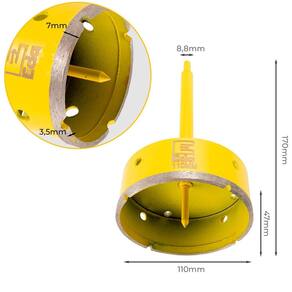 Kit 2 Serras Copo Diamantada 110mm com Haste Pino Guia Eda Profissional Serra copo diamantada com haste e pino guia, indicada para cortar telhas, tijolos, cerâmicas, azulejos, concreto, parede, pedras, refratários, granitos entre outros. - Marca: Eda Profissional - Jogo com 2 serras copo - Diâmetro: 110mm - Serra Copo com haste e pino guia - Ideal para alvenaria - Comprimento da haste: 170mm - Diâmetro do encaixe da haste no mandril: 8,8mm - Altura externa do copo: 47mm - Altura da borda diamantada: 7mm - Espessura do copo: 3,5 mm - Facilita a realização de furos de grandes diâmetros em tempo reduzido - Indicada para cortar telhas, tijolos, cerâmicas, azulejos, concreto, parede, pedras, refratários, granitos entre outros. - Quando utilizada com o pino guia, deve-se fazer um furo com broca de vídea antes. - Nunca utilizar o equipamento na função IMPACTO/MARTELETE - Haste e corpo em aço carbono - Camada de corte: Pasta abrasiva com diamante - Utilize com refrigeração - Peso bruto: 830 gramas - Garantia: 90 dias