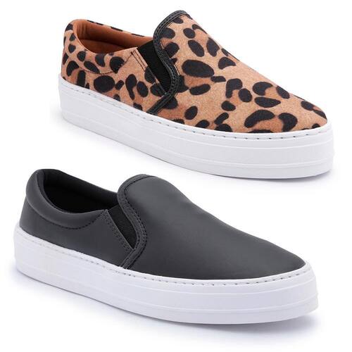 Slip On é uma peça curinga para o dia a dia. Confeccionados em material tecnológico e forro em material têxtil trazendo conforto ao caminhar. Além de seu solado flatform 4cm emborracha antiderrapante que transmite toda segurança. Kit comporto por 2 pares.
