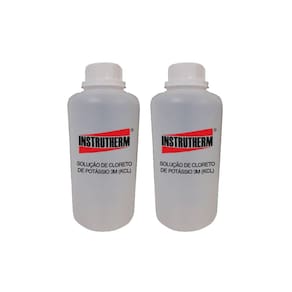 KIT 2 SOLUÇÃO DE CLORETO DE POTÁSSIO (KCL) 3M, 1 LITRO, USADA NA CONSERVAÇÃO DE ELETRODOS DE PH DESCRIÇÂO: Solução utilizada para conservação/ descanso de eletrodos de vidro dos medidores de pH. APLICAÇÃO Manutenção e conservação de eletrodos de pH construídos em vidro. ESPECIFICAÇÕES TÉCNICAS: Solução: Cloreto de potássio 3M Quantidade: 1000ml Validade: 12 meses após a data de fabricação Temperatura de Operação: 10 á 30°C Umidade de Operação: < 90% U.R ITENS FORNECIDOS: 2 - Solução de cloreto de potássio 1L
