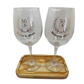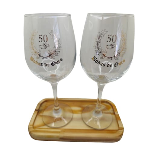 Kit 2 com Bandeja Taças Bodas de Ouro 50 anos Casal Cristal Personalizada Vinho 490ml - Nadir Figueiredo - Barone