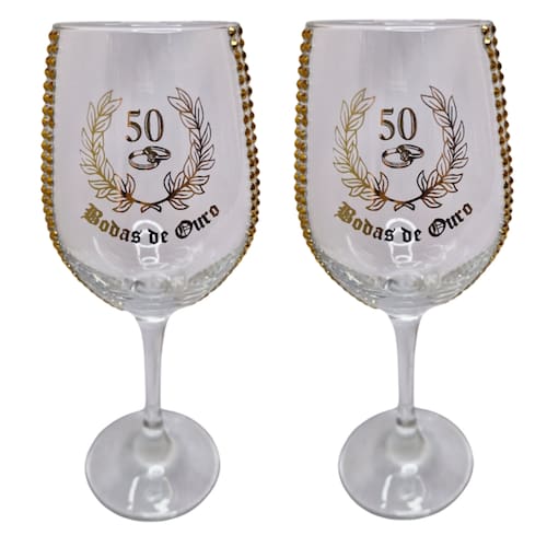 Adquira esta Taça maravilhosa e ganhe um lindo presente. Kit 2 Taças Vidro Bodas de Ouro 50 Anos Luxo Personalizada Vinho 490ml - Nadir Figueiredo - Barone
