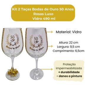 Kit 2 Taças Vidro Bodas de Ouro 50 Anos Luxo Rosa Kit 2 Taças Vidro Bodas de Ouro 50 Anos Rosas Luxo Personalizada Vinho 490ml - Nadir Figueiredo - Barone