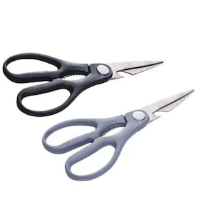 Garantia: 90 dias / Peso total: 156g / Cor predominante: colorido / Referência: 7794463324546; Dimensões de cada tesoura: 20cm (C) x 8,5cm (L) x 1cm (A); Conteúdo: 2 tesouras para cozinha; Materiais: aço inox e fibra de bambu; Obs.: o produto é enviado de forma diversa, conforme cores disponíveis em estoque. Não é possível escolha de cor, variando em: cinza, preto e branco.