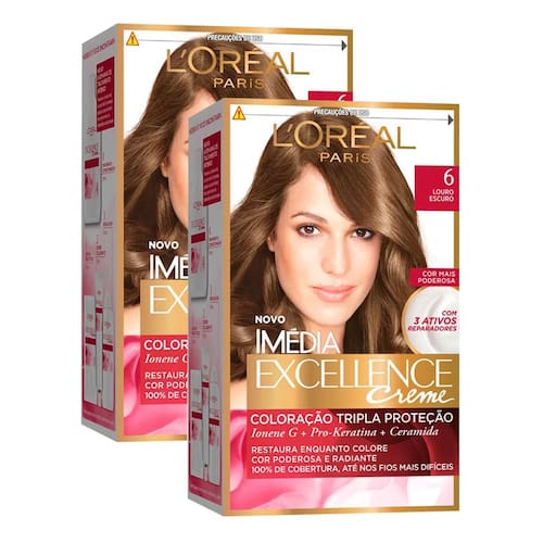 TINTURA CREME IMÉDIA EXCELLENCE L'ORÉAL LOURO ESCURO 6 Coloração Creme Protetora e Revitalizante Pro-Keratina Cobre 100% dos Fios Brancos Protege e Reforça os Cabelos Cor Rica, Viva e de Longa Duração Serum Protetor Tratamento Antes da Coloração A maior parte do cabelo é composta por queratina, que tem um papel fundamental para a saúde dos fios. Mas com o tempo, a queratina vai se degenerando. O novo imédia Excellence Creme, enriquecido com Pro-Keratina, protege, reforça e revitaliza os cabelos, deixando-os mais fortes com uma cor de vida, brilhante e você, com uma aparência mais jovem. Este Kit contém: • Um Serum Protetor 12 ml • Um frasco Aplicador de revelador Creme 70 ml • Um Pente Aplicador • Um Tubo de Creme Colorante 47 g • Um frasco de Tratamento Condicionador 40 ml • Um folheto Explicativo e Um par de luvas Coloração Permanente Durabilidade: Duração muito longa. Cobertura de Brancos: Perfeita cobertura dos cabelos brancos. Textura: Creme - Não escorre. Tempo de Pausa: 35 a 400 minutos. Conselhos Especiais: • Se você tem grande quantidade de cabelos brancos, o resultado obtido será mais claro do que o apresentado na embalagem. Prefira cores sem reflexo para um melhor resultado. • Para cabelos longos ou com volume, recomendamos usar 2 kits para a primeira aplicação. Seu programa de Proteção e força em 3 etapas: Etapa 1 Sérum Protetor Antes da Coloração: Prepara as partes danificadas. Aplicar no comprimento e pontas. Etapa 2 Creme Super-Clareador com PRÓ-KERATINA Durante a Coloração: Colore e Protege. Etapa 3 Tratamento Condicionador Após a Coloração: Devolve a suavidade e maciez aos cabelos. Resultado sem descoloração prévias: • Fios mais macios e sedosos. • Uma cor rica e viva. • Cobertura 100% dos fios brancos. Precauções de uso: Importante as colorações podem provocar uma reação alérgica que, em alguns casos, ainda que raros, pode ser grave. É obrigatório em todos os casos fazer uma prova de toque (teste de alergia cutânea), Imperativamente 48 horas antes de cada utilização deste produto ( ver folheto explicativo). • Não Utilize se: - já apresentou alguma reação alérgica a um produto de coloração. - o seu couro cabeludo está irritado ou lesionado. • Tatuagem Hena Preta: Se você já fez, mesmo que uma única vez, uma tatuagem de hena preta, provavelmente você corre o risco de ter se tornado alérgico sem saber. Não use este produto sem fazer a prova de toque (teste de alergia cutânea) 48 horas antes de cada aplicação do produto. Pense em comprar seu produto de coloração com antecedência para fazer a prova de toque (teste de alergia cutânea) 48 horas antes do uso. Siga as instruções e precauções de uso do folheto explicativo. Marca: Não Informado