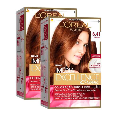 TINTURA CREME IMÉDIA EXCELLENCE L'ORÉAL MARROM 6.41 Imédia Excellence Creme é a coloração permanente de L’Oréal Paris. Sua tecnologia avançada protege e cuida dos cabelos antes, durante e depois da coloração, com até 6 semanas de tratamento condicionador intenso. São 3 poderosos ativos reparadores: Pró-Keratina, que protege e fortalece os fios; Ceramida, que reforça a fibra capilar; e Ionene G, que restaura enquanto colore. O kit de Imédia Excellence contém: Sérum protetor pré-coloração: 12 ml; Creme colorante extra protetor com amônia: 47g; Revelador: 70 ml; Tratamento condicionador: 60 ml. Imédia Excellence possui o cuidado mais poderoso para um resultado de cor impecável e duradouro. A exclusiva tripla proteção conta com 3 ativos reparadores: Ceramida é um lipídio (gordura) presente naturalmente nos cabelos, entre as escamas. Sua função é reter água e nutrientes, mantendo a integridade dos fios e sendo responsável por reforçar a fibra capilar. A Pro-Keratina protege e fortalece os fios deixando-os macios e sedosos. Já o Ionene G é um polímero (molécula) que restaura os danos causados pelos compostos químicos contidos na coloração enquanto colore. Marca: Não Informado