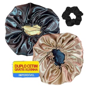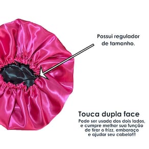 * Uso recomendado: Durante a noite * Tipo de cabelo recomendado: Todos * Modelo: Ajustável * Camadas: Dupla face (2 cores) * Itens Inclusos: 2 Toucas de cetim Ajustável dupla face e 2 Xuxinhas