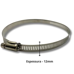 Kit 2 Un Abraçadeira Regulagem 120 até 140mm Rosca 12 à 14cm Metal 12mm Espessura Aço Para Mangueira - ABRAÇADEIRA METÁLICA - Diâmetro mínimo: 12cm - Diâmetro máximo:14cm - Quantidade: 2 peças - Espessura: 12mm - Material: Aço Zincado - Diferencial: Fácil de ajustar