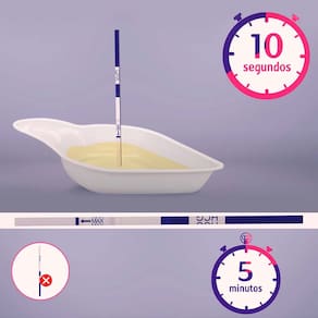 Apoie a fita em uma superfície limpa, seca e não absorvente, por exemplo a borda do recipiente coletor, e aguarde até o aparecimento de uma faixa vermelha ou rosa, que já indica que o teste está validado. Para um resultado positivo, geralmente de 2 a 3 minutos, começa a aparecer a segunda faixa vermelha ou rosa.