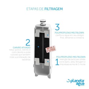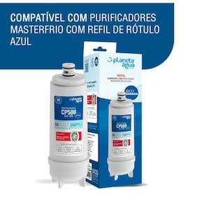 Kit com 2 refis de filtro para purificador de água Planeta Água CP500, compatíveis com Master Frio Rótulo Azul. Possuem 3 estágios de filtragem, controlando bactérias e removendo impurezas como ferrugem, barro e areia.Tipo