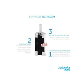 É capaz de eliminar todo e qualquer gosto ou cheiro da água, reduz a quantidade do cloro, controla a proliferação de bactérias e filtra partículas acima de 15 micras, como por exemplo, areia, barro e ferrugem. Ótimo custo-benefício, com o Refil Filtro você pode economizar muito mais em galões de água mineral. Compre agora