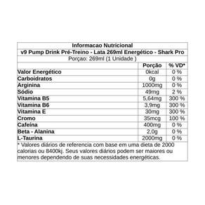 Kit 2 V9 Pump Pré-Treino Drink Energético Zero Carbo e Kcal - SharkPro O V9 Pump é o pré-treino líquido ideal para quem busca energia, foco e Desempenho. Com sabor de energético, é prático, refrescante e perfeito Para ser consumido gelado, proporcionando uma experiência única antes do Treino. Na versão em lata de 269ml, o V9 Pump Drink Pré-Treino é uma opção Rápida e conveniente. Com fórmula estratégica e zero carboidratos, Oferece praticidade com sabor vibrante. Sugestões de Consumo - Consumir 1 lata 269ml cerca de 30 minutos antes Do treino - Pode ser consumido gelado para melhor refrescância Destaques do Produto - Pré-treino em versão líquida prática - Zero Carboidratos e zero calorias - Fórmula com cafeína e taurina - Sabor Energético marcante - Pronto para beber em lata de 269ml - Ideal para Consumo pré ou intra-treino Ingredientes Água, beta-alanina, L-arginina, taurina, cafeína anidra, Acidulante ácido cítrico, aroma idêntico ao natural de cola, Conservadores benzoato de sódio e sorbato de potássio, edulcorantes Sucralose e acessulfame de potássio, corante caramelo IV. Marca: Não Informado