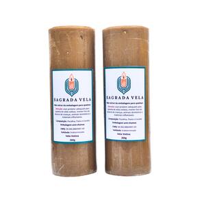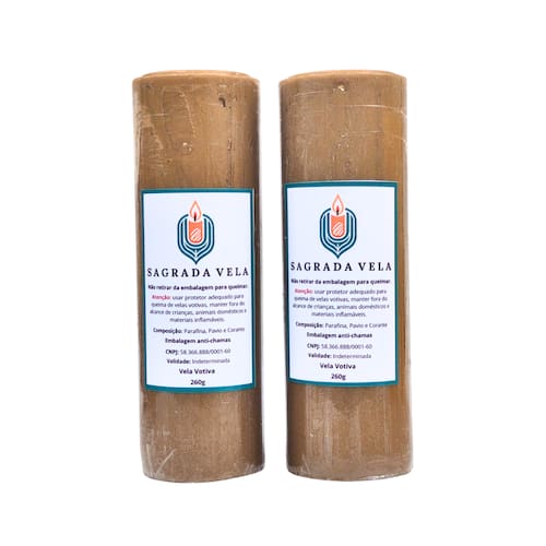 Contém 2 unidades. Cor: Dourada. Peso: 260 gramas. Altura: 15 cm. Diâmetro: 50 mm. Composição: Parafina, Corante e Pavio. Validade: Indeterminada. Marca: SAGRADA VELA.