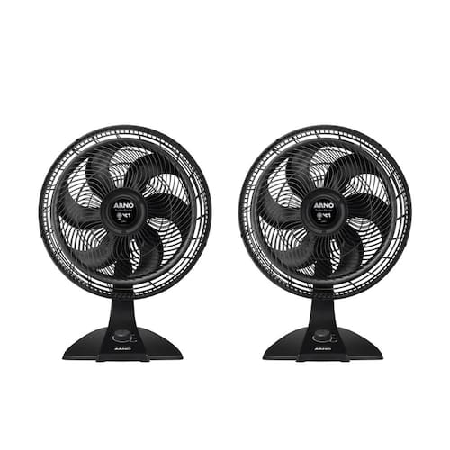 O Kit contém 2 ventiladores Arno Turbo Force VF42, cada um com 40cm de diâmetro, 6 pás aerodinâmicas e tecnologia Power Zone, que concentra o fluxo de ar para proporcionar ventilação eficiente. Os modelos podem ser utilizados na mesa ou fixados na parede, oferecendo praticidade e adaptação a diferentes ambientes.