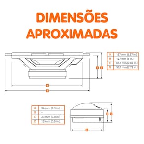 CONTEÚDO DA EMBALAGEM: - 1 PAR de Alto Falante 6 Polegadas; - 1 PAR de Tweeter - 1 PAR de Aro adaptador - 1 Chicote de Ligação - Acessórios de Instalação