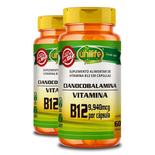 Kit 2 vitamina b12 cianocobalamina unilife 60 cápsulas Sobre o produto Vitamina de oritem sintética, produto vegano, sem origem animal A vitamina b12, é fundamental para todos os músculos do nosso organismo, sistema nervoso e saúde do sangue. Essa vitamina não é produzida no nosso corpo e por isso deve ser ingerida na alimentação ou através de suplementação. Como é produzida por alguns microrganismos presentes em produtos de origem animal e poucos alimentos vegetais possuem essa vitamina, é extremamente importante para os vegetarianos realizarem a suplementação, evitando anemias, derrames e até mesmo doenças cardiovasculares. Benefícios Benefícios do uso da vitamina b12 cobalamina em cápsulas Ajuda a formar as células vermelhas do sangue; é o mais poderoso antianêmico já existente para a anemia perniciosa; Melhora a capacidade da memória e concentração; É necessária para auxiliar na formação e longevidade das células; Importante para uma digestão apropriada, absorção dos alimentos; Previne danos aos nervos, mantém a fertilidade; sua deficiência causa atrasos no crescimento, distúrbios nervosos e reprodutivos. Como usar a vitamina b12 em cápsulas Sugere-se a ingestão de 1 cápsula ao dia, após a refeição. Ingerir com líquido. Modo de uso 100% da ingestão diária recomendada em apenas 1 cápsula Ingredientes Vitamina b12 cianocobalamina , excipiente .S.P. 450mg, gelatina vegetariana e água. Não contém glúten. Livre de lactose. Produto vegano. Cada cápsula contém 2,4 mcg de vitamina b12. Marca: Não Informado Ean: 7908609507353