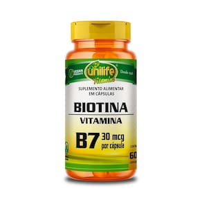 O que é a Vitamina B7 Biotina da Unilife A vitamina B7 Biotina da Unilife faz parte do complexo de Vitamina B, todas vitaminas do complexo B não são produzidas pelo corpo, ou seja precisamos adquirir ela por dietas, entretanto a Vitamina B7 está presente na maioria dos alimentos, mas ela é umas das mais ausentes em todos os organismo, isso acontece devido ela ser muito frágil, e no seu processamento pode ser destruída com muita facilidade e assim perdemos todos seus nutrientes, o que nos resta é suplementar a Vitamina B7 Biotina para obter a quantidade exata sem nenhuma preocupação, pois a carência de B7 pode afetar diretamente o sistema nervoso, coração, e a função digestiva. Como utilizar a vitamina Biotina B7 da Unilife A fabricante Unilife recomenda a utilização de 1 cápsula diária após a principal refeição do dia, deve-se consumir juntamente com líquidos para melhor absorção pelo organismo. A equipe da Edin adverte que qualquer alteração dessa dosagem deve ser feito com um acompanhamento nutricional adequado. Marca: Não Informado