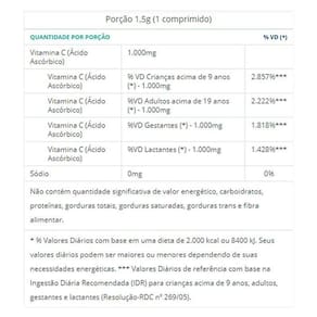 Kit 2 Vitamina C 1000mg Catarinense Pharma 30 Cápsulas A vitamina C auxilia na absorção de ferro dos alimentos, no metabolismo de proteínas e gorduras e no metabolismo energético. A vitamina C é um antioxidante que auxilia na proteção dos danos causados pelos radicais livres e na formação do colágeno. A vitamina C auxilia na regeneração da forma reduzida da vitamina E e no funcionamento do sistema imune. Ingredientes Ácido ascórbico. Agente carreador celulose microcristalina INS 460i , estabilizante croscarmelose sódica INS 468 , glaceantes: copolímero enxertado de álcool polivinílico e polietilenoglicol INS 1209 , talco INS 553iii , hidroxipropilcelulose INS 463 , polivinil álcool INS 1203 , antiaglutinantes: estearato de magnésio INS 470iii , dióxido de silício INS 551 , corantes: dióxido de titânio INS 171 e laca de alumínio com amarelo crepúsculo INS 110 e emulsificante mono e diglicerídeos de ácidos graxos INS 471 . NÃO CONTÉM GLÚTEN. Recomendações de Uso Consumir 1 comprimido ao dia, atende 100% da Ingestão Diária Recomendada IDR para adultos 19 anos ou mais . Deve ser ingerido com líquido.