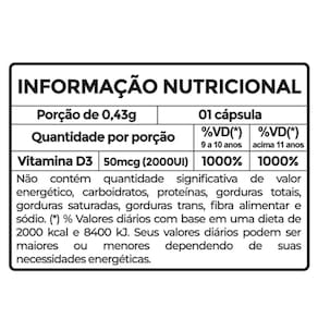 Ingredientes: Óleo de girassol, colecalciferol e antioxidante dl-alfa tocoferol. Composição da cápsula: gelatina, água purificada, umectante glicerina e corante natural cúrcuma. NÃO CONTÉM GLÚTEN.