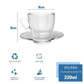 Conjunto de Xícaras de 220ml Conjuntos de xícaras e pires transparentes de 90ml são uma escolha popular para servir bebidas quentes como café e chá. Possuem um design simples e elegante. Feitos de vidro transparente de alta qualidade, essas xícaras permitem que você veja a cor e a textura de sua bebida, tornando-a uma experiência visualmente agradável. O tamanho de 90ml é perfeito para uma dose individual de café ou chá, tornando esses conjuntos ideais para uso doméstico ou para servir pequenas reuniões.