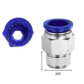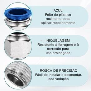 Conexao instantanea , modelo:reta macho, rosca:1/8 bsp, tubo:06 mm, pressao de trabalho:8 bar, fluido:ar, material:ferro,plastico,garra em zinco, temperatura de trabalho:0-60c