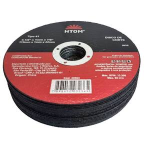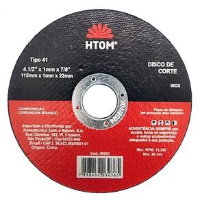 Kit com 20 Discos de Corte Fino 4 1/2 Pol. 115mm para Esmerilhadeira Inox Metal HTOM Disco de corte 115mm indicado para cortar inox e metal com esmerilhadeiras. Furo de 22mm e espessura de 1mm. - Marca: HTOM - Referência: HTOM-40563-20x - Kit com 20 Discos - Diâmetro: 4-12 115mm - Furo: 7/8 22m - Espessura: 1mm - Indicado para corte de metais em geral e aço inoxidável - Rotação máxima: 13.300 rpm - Composição: corundum branco - : 90 dias contra defeito de fabricação