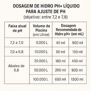 Faixa atual de pH Volume da Piscina (em Litros) Dosagem Recomendada de Hidro pH+ (em mL)