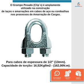 Grampo para cabo de aço pesado STARFER 1/2O Grampo Pesado (Clip´s) é amplamente utilizado na construção de laços e amarrações em cabos de aço ou cordoalhas nos processos de Amarração de Cargas.Para a correta utilização do Grampo Pesado as normas de montagem dos grampos e construção dos laços devem ser rigorosamente seguidas.Grampo com corpo fundido em aço carbono galvanizado, alças e porcas em aço 1020 de acordo com a norma DIN 741.Não deve ser utilizado em aplicações de movimentação de cargas.• Material: Aço Carbono Galvanizado• Tamanho 1/2" (13mm).• Capacidade de torção: 16,52kgf/m2 (162,00N.m).Embalagem: Saco plástico com 20 peças.Ref. 07015054Marca: Starfer*IMAGENS MERAMENTE ILUSTRATIVAS*