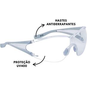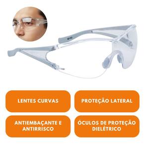 Óculos de proteção monobloco com amplo campo de proteção e proteções laterais, compatibilidade com protetores auriculares.