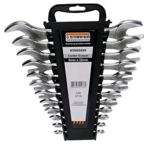 Jogo De Chave Estrela Starfer 8 Peças 6 A 22mm. Utilizados em porcas, parafusos quadrados e sextavados.Acabamento niquelado e cromado. Composto por 8 peças, com medidas:6 e 7, 8 e 9, 10 e 11, 12 e 13, 14 e 15, 16 e 17, 18 e 19, 20 e 22mmRef:. 3502589 Jogo de chave fixa com 12 peças.6mm a 32mm com 12 Peças Aço Carbono Cromado. Composição: 6x7, 8x9, 10x11, 12x13, 14x15, 16x17, 18x19, 20x22, 21x23, 24x26, 25x28 e 27x32mmRef.: 03502295Material: Aço carbono. Acabamento: Cromado.