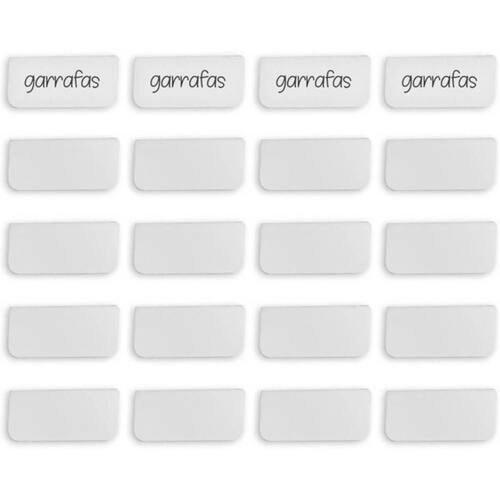 Garantia: 90 dias / Peso total: 150g / Cor predominante: branco / Ref: 7794463744337 Dimensões de cada: 5,5cm (C) x 0,5cm (L) x 2,5cm (A); Conteúdo: 20 placas identificadoras; Material: polipropileno (PP); Cuidados: não lavar com materiais abrasivos;