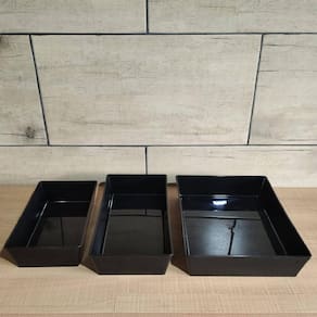 Garantia: 90 dias / Peso total: 4,880kg / Cor predominante: preto / Ref: 7798138563261; Dimensões de cada travessa retangular: 26,5cm (C) x 16cm (L) x 7cm (A); Capacidade de cada tigela: 2,2 litros; Material: polipropileno; Conteúdo: 20 travessas pretas.