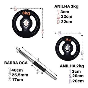 Academia em casa: Kit para quem está iniciando ou retomando suas atividades.O kit é composto por:2 barras OCA 40cm com presilhas4 anilhas de 3kg emborrachadas4 anilhas de 2kg emborrachadas- 2 pares de presilhasAs barras maciças cromadas podem ser utilizadas para exercícios de peso livre e suportam até 50kg de anilhas na montagem dos halteres. Com o peso de aproximadamente de 1,5kg e possui um diâmetro de 27,5mm podendo ser utilizada com qualquer tipo de anilha que tenha furação comum. Com sistema pratico de travamento com presilhas. Cabem no máximo em cada barra até 8 anilhas de 5kg.As anilhas são discos de peso com um furo em seu centro e marcação numérica de acordo com o seu peso. Revestida com PVC as anilhas possuem furo central com diâmetro de 30mm a 33mm, servindo em barras de 25,5mm à 28,5mm. Podendo ser utilizadas sozinhas ou em conjunto com as barras, para treinamentos de musculação, funcional, entre outros diversos tipos de exercícios. Devido a suas diversas formas de utilização, as anilhas possuem o melhor custo benefício do mercado para o exercício de musculação.Caso queira montar kits apenas com anilhas, verifique nossos outros anúncios.Lembrando de ter sempre um profissional fazendo o acompanhamento do seu treino. Nossos produtos tem qualidade garantida, fazendo assim com que nossa empresa Anilhas & Cia seja a líder do mercado de equipamentos fitness.Temos também diversos produtos fitness como por exemplo: - Anilhas - Barras - Halteres Entre outros. Marca: Anilhas&Cia