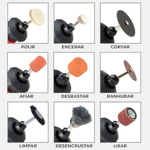 Kit com 210 Acessórios para Micro Retífica Completo Dremax. Com 105 peças para lixar, polir, cortar, esmerilhar, limpar, gravar, desbastar, furar, etc. - Marca: Dremax - Modelo: KA105-2X - Kit completo com 210 peças para lixar, polir, esmerilhar, limpar, gravar, desbastar e furar - Hastes de 3mm padrão de todas as micro retíficas - Uso em micro retíficas de qualquer marca - Peso bruto: 162 gramas - : 90 dias contra defeitos de fabricação Itens Inclusos: - 6 Discos de Corte 32mm Reforçados - 70 Discos De Corte 24mm - 70 Discos De Lixa 20mm - 18 Tubos De Lixa 12,7mm - 2 Disco de Polimento 25,4mm - 12 Discos de Polimento 12,7mm - 2 Ponta de Feltro 10mm - 2 Ponta Montada 10mm Carboneto de Silício verde - 2 Ponta Montada 20mm Carboneto de Silício verde - 2 Ponta Montada 9,5mm Óxido de Alumínio laranja - 2 Ponta Montada 14,3mm Óxido de Alumínio laranja - 2 Ponta Montada 6mm Óxido de Alumínio rosa - 2 Ponta Montada 6mm Arredondada Óxido de Alumínio rosa - 2 Escova Copo 12mm Aço - 2 Escova 20mm Nylon - 2 Suporte para Tubo de Lixa 12,7mm - 2 Suporte para Discos de Corte e Lixa - 2 Suporte para Disco de Feltro - 2 Pasta de Polimento - 2 Pedra para Afiar - 4 Potes Plásticos Marca: Não Informado